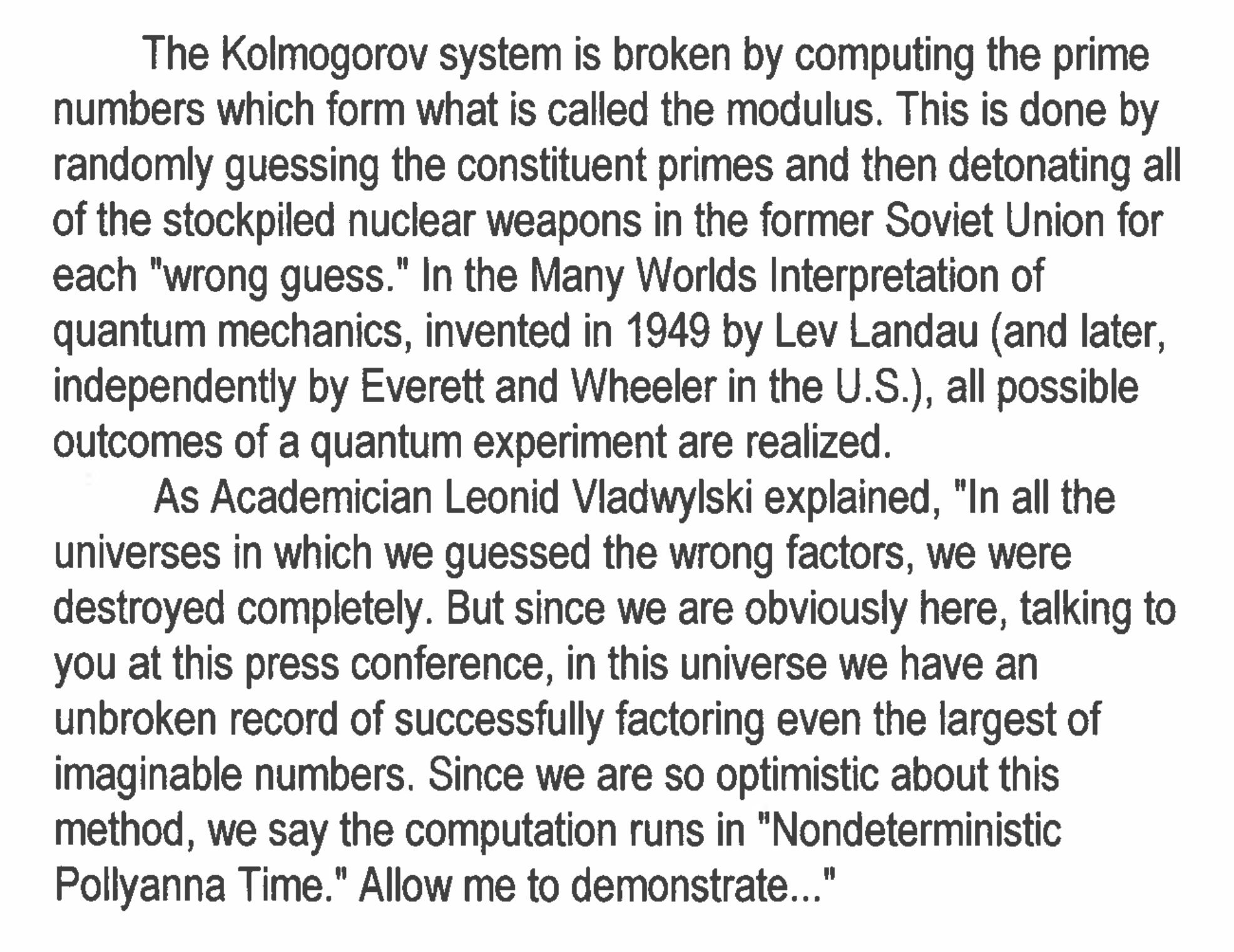 On April 1st, 1994, someone on Usenet posted a joke about a Russian computer that uses quantum mechanics to factor large numbers. As Peter described it: "The computer chose two random numbers and multiplied them together, and if this wasn't the factor, it exploded a nuclear plant. So by the many-worlds hypothesis, any world in which the bomb did not explode, the computer factored."